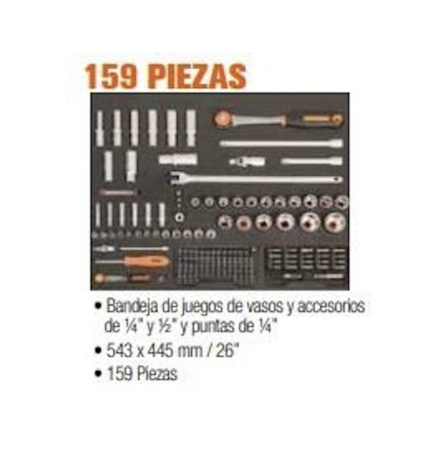 Bandeja de 159 piezas (543x445mm). Bandeja de juegos de vasos y accesorios de 1/4" y 1/2" y puntas de 1/4".