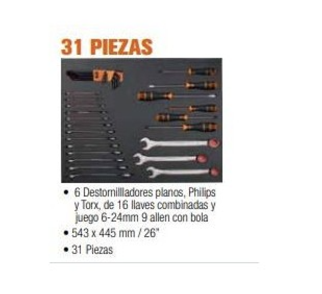 Bandeja de 35 piezas (543x445mm). 10 destornilladores planos, Philips y Torx, 16 llaves combinadas 6-24mm y juego de 9 allen con bola.