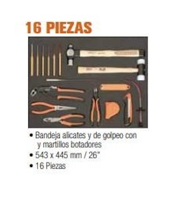Bandeja de 16 piezas (543x445mm). Bandeja alicaterio y de golpeo con martillos y botadores.