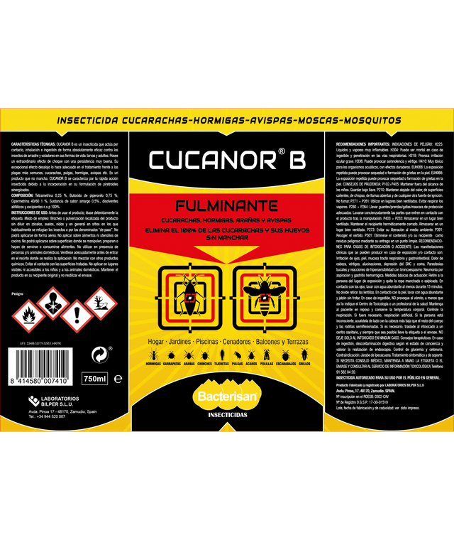 Composición: Cipermetrina 40/60 1%, Tetrametrina 0,25%, Butoxido de Piperonilo 0,75%, Sustancia de sabor amargo 0,5%, Disolventes alifáticos y excipientes csp 100%
