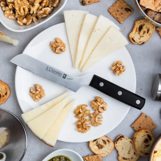 - La hoja recta y el mango elevado están especialmente diseñados para facilitar el corte de los quesos.