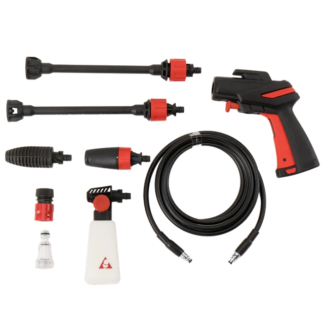 Hidrolimpiadora compacta de 120 bar de presión, 1.4 Kw de potencia y un caudal de 330l/h. Ideal para la limpieza de bicicletas, muebles de jardín, superficies exteriores de hasta 30m2.... La pistola No force minimiza la fuerza que debe ejercer el usuario durante su uso, aportando la máxima comodidad. Incluye una boquilla turbo para concentrar la presión, una boquilla regulable, un rociador de espuma ajustable con depósito de jabón, dos lanzas y conector rápido de manguera. La manguera de alta presión de PVC tiene una longitud de 3m. Ofrece la posibilidad de aspirar agua desde cualquier depósito. Su filtro de entrada de agua externo facilita su limpieza y mantenimiento. Tiene ruedas de transporte y un cable de alimentación de 5m.