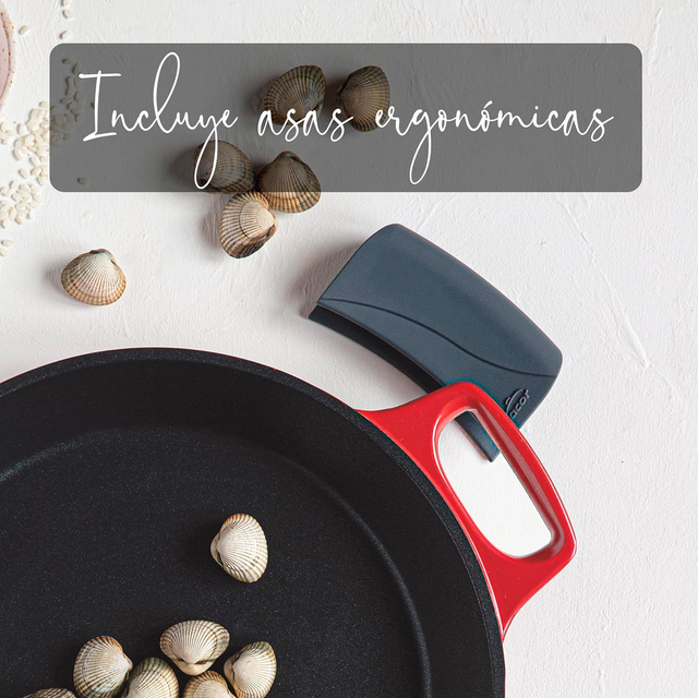 Paellera fabricada en aluminio fundido. Perfecta para arroces, carnes, pescados, legumbres, verduras, guisos, cremas, salsas, sopas, etc.